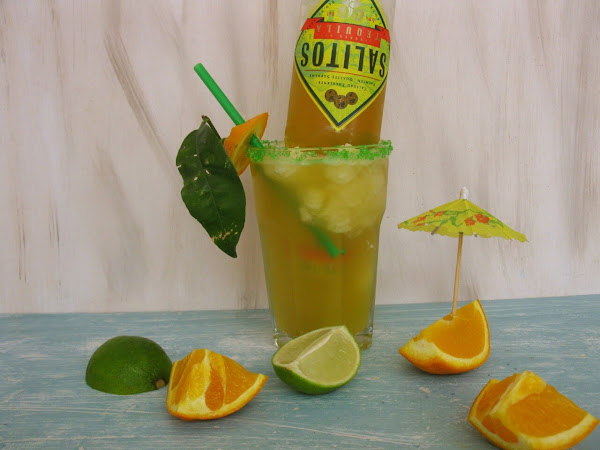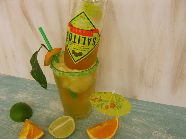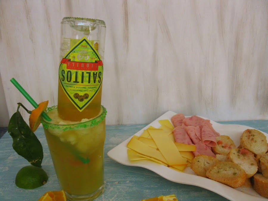 Exprimir la lima y la naranja lo ponemos en la batidora añadimos el jarabe de azucar ,hielo y lo batimos todo hasta dejarlo como granizado ,llenamos el vaso hasta la mitad y ponemos dentro la CERVEZA SALITOS DE TEQUILA