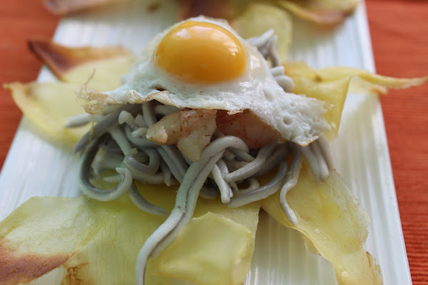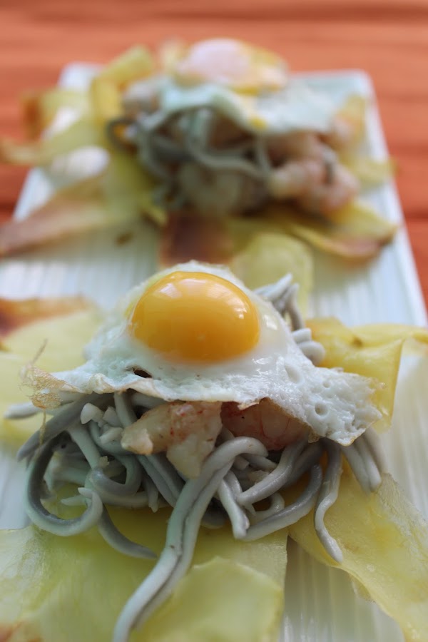 2 patatas medianas, 1 huevo, 250 g angulas sucedáneas, 250 g langostinos,1 cayena, 2 dientes ajo, huevos codorniz