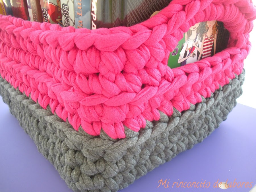 Pues aquí tenéis otra cesta de trapillo, esta vez su destino es la habitación de las niñas y su utilidad es la de guardar los libros que ya no cabían en las estanterías.