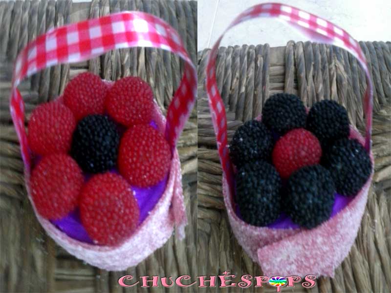 Las primeras que os voy a enseñar son mis favoritas, dos cestas con golosinas de mora con forma de flor una en color rojo y otra en color negro, así, hay para todos los gustos.