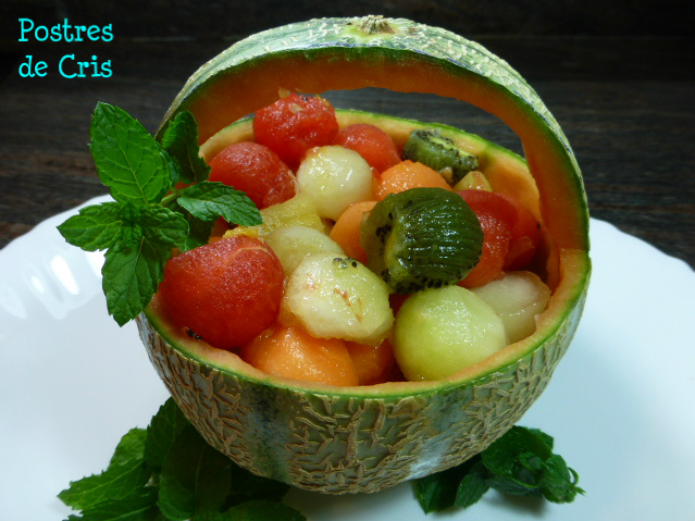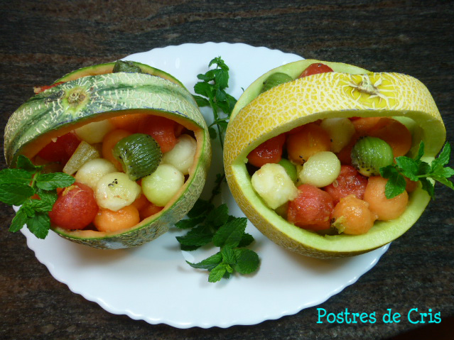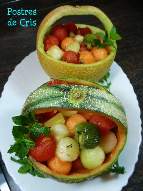 Abrimos el melón en forma de cesta. Marcamos con un lapiz la mitad del melón. Luego con la ayuda de una tira de papel marcamos lo que será el asa de la cesta. Ya sólo queda cortar con cuidado y vacíar la carne del melón haciendo bolitas.