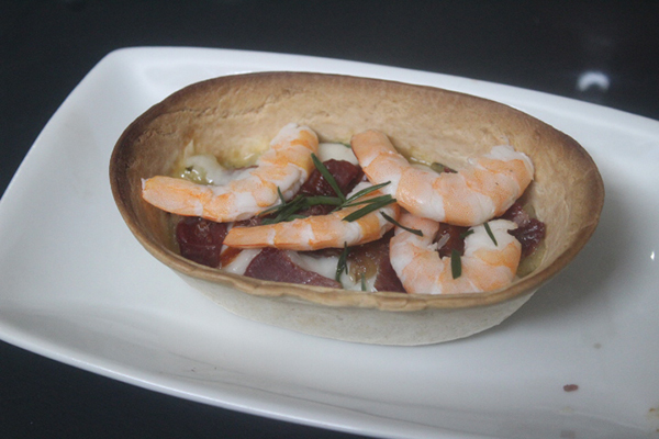 Sacamos del horno y decoramos con las gambas peladas (frías) y distribuimos sobre ellas el cebollino fresco troceado.
