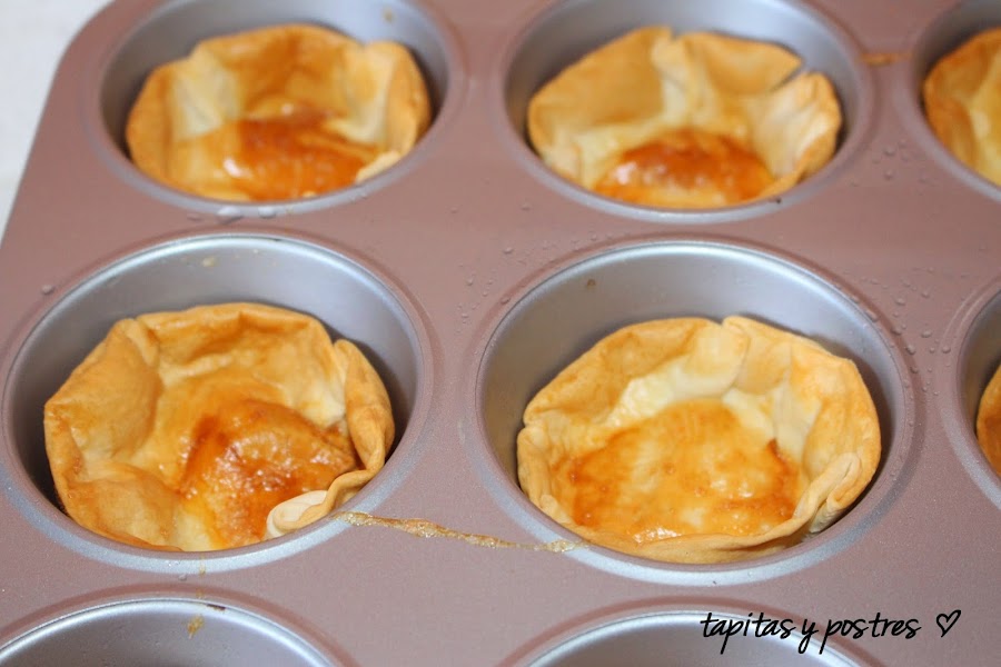 En un molde de metálico de magdalenas, colocamos las obleas dentro dando forma de cestas.