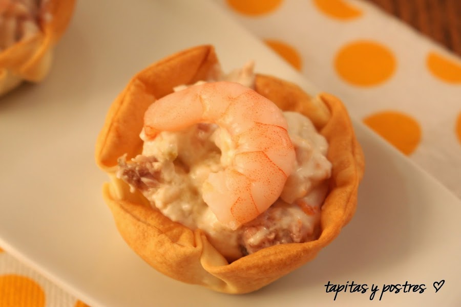 La idea me surgió después de ver una receta en el blog de La juani, donde con obleas de empanadillas y un relleno especial, preparaba unos pastelitos de gambas increíbles.
