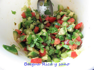 7. Mezclamos el aliño con los ingredientes de la ensalada: pepino, aguacate, tomate, cebolleta y jalapeño. Reservamos en el frigo.