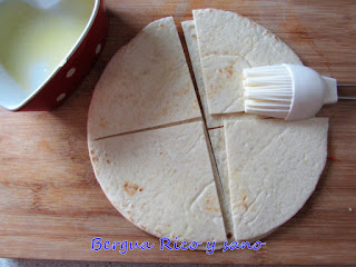 1. Cortamos las tortillas en cruz, de forma que nos queden 4 cuartos en cada tortilla.