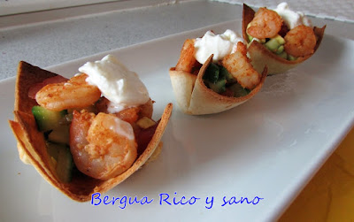 9. Ya tenemos todos los elementos y podemos rellenar nuestras cestitas: primero ensalada, luego coronamos con las gambas y finalmente, un pegotito de yogur griego para rebajar el picante. ¡Listo!