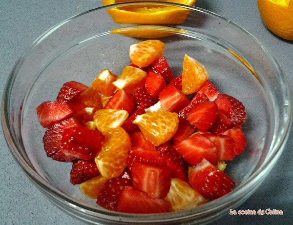 Lavar muy bien los fresones y picarlos. Mezclarlo todo en un bol y guardarlo macerando durante una hora en el frigorífico.