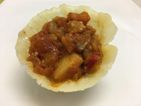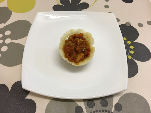 - Desmolda y coloca una cucharada de pisto manchego dentro.