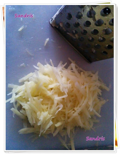 Rallé la patata de dos formas. La quería en juliana, paja se puede decir, así bien finita para que se haga en un plis plas. Así que lo intenté de dos formas: una a cuchillo y otra con el rallador. Y si soy sincera, a mí me ha gustado más como se queda para hacer cestitas con el rallador.