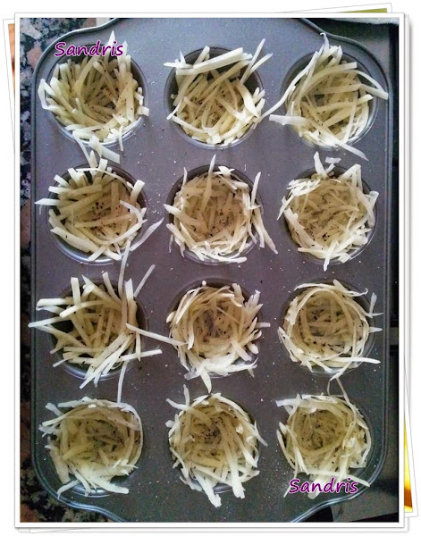 Y nada más. Como no sabía como montar las cestitas, lo que se me ocurrió fue ponerlo en el molde de magdalenas; es la única forma que tenía a mano en casa que se pudiera parecer a una cestita; y la verdad que resultó muy buena idea porque se quedaron perfectas. No quería una cestita grande. Más bien quería que se quedara tipo tapa que con dos bocados o tres se termine la tapa. Se corta la verdura que uno quiera y se monta al gusto del consumidor.