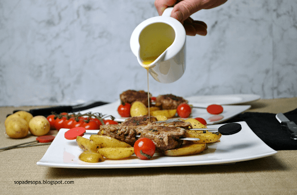 Servir; Repartir en los platos las patatas con los tomates, colocar encima las brochetas y servir con la mantequilla al limón.
