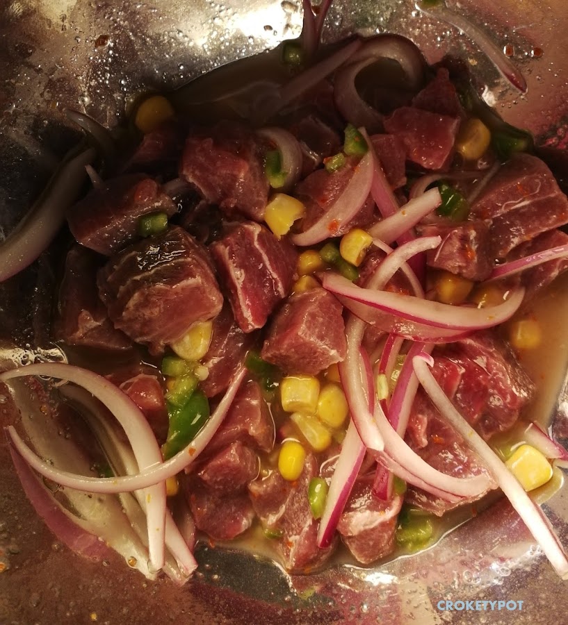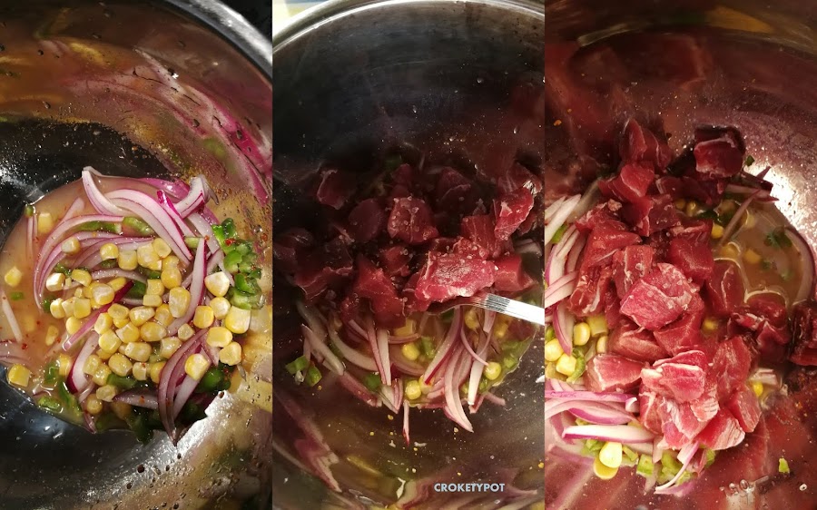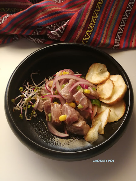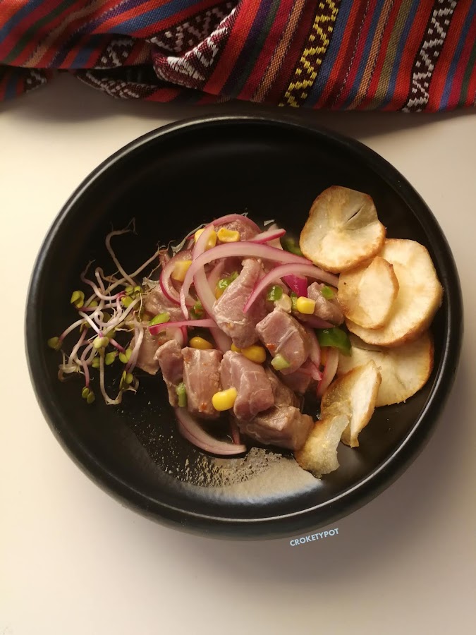 INGREDIENTES: 2 filetes de atún rojo de centimetro y medio de grosor, 2 limas, copos de guindilla, cebolla morada, pimiento verde, maiz fresco, brotes de rábano, sal. Para acompañar yuca frita.