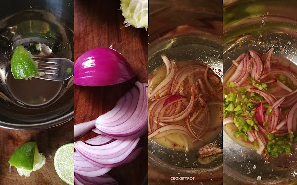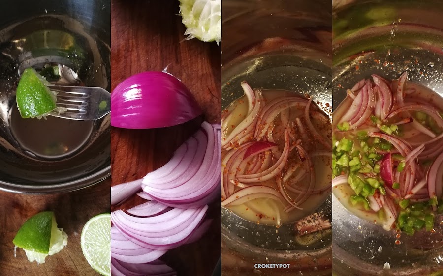 ELABORACIÓN: Preparamos la "leche de tigre" que es donde maceramos el pescado. En un bol, ponemos el zumo de lima, la cebolla morada cortada muy finita que la lavaremos en agua un par de minutos para quitarle la fuerza, la pasamos al bol junto con los copos de guindilla y el pimiento verde troceado pequeño y sal, lo dejamos en la nevera tapado media hora.