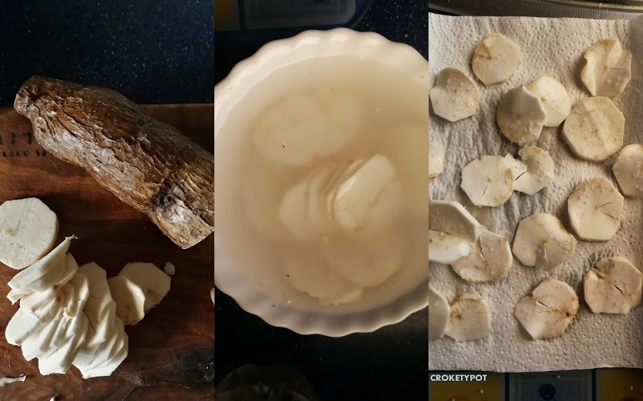 Preparamos la yuca, la pelamos y se corta en rebanadas finas, las ponemos en un bol con agua, luego las escurrimos sobre un papel, se le pone sal y las freímos en aceite de oliva AOVE.