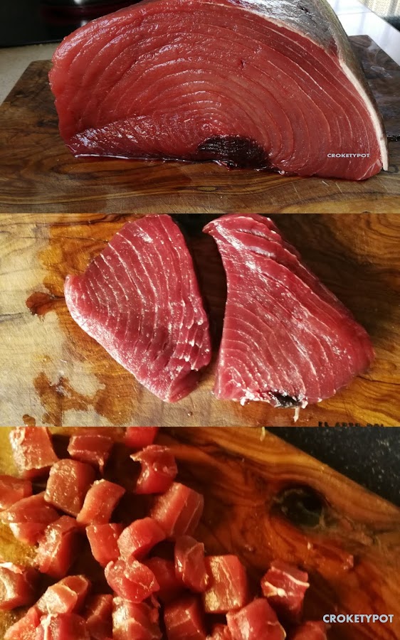 Cortamos el filete de atún en cubos, y reservamos.