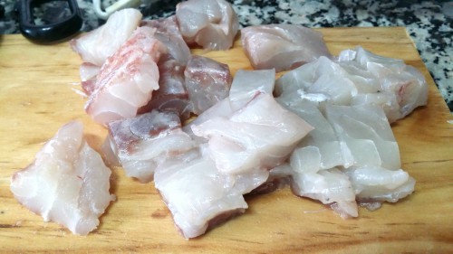 - Cortaremos el pescado en cubos de un par de centímetros