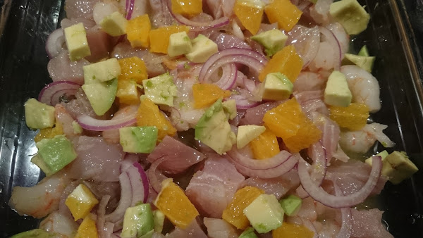 Una vez descongelado nuestros protagonistas les vamos a dar salida. Troceamos el bonito en trozos de bocado y los disponemos en una bandeja o bol. Añadimos los gambones, la cebolla morada laminada y los gajos de las naranjas en trocitos.