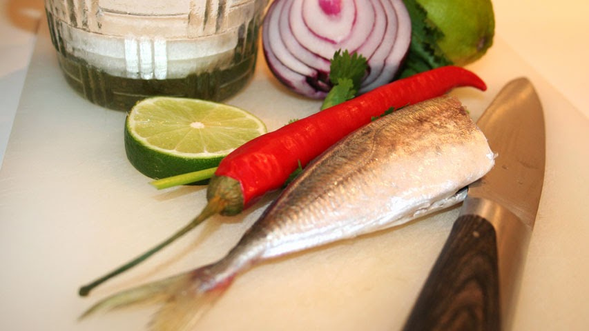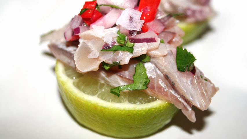 Uno de los platos, el que más me gustó a mi, fue un cebiche de jurel de Málaga (Trachurus mediterraneus) y he intentado reproducirlo (a mi manera) en casa. Sergio lo acompaña con una salsita que yo no he ni siquiera intentado reproducir, me he limitado a tomar la idea de Sergio pero con un ceviche clásico: cebollita roja, chile, cilantro y zumo de lima.