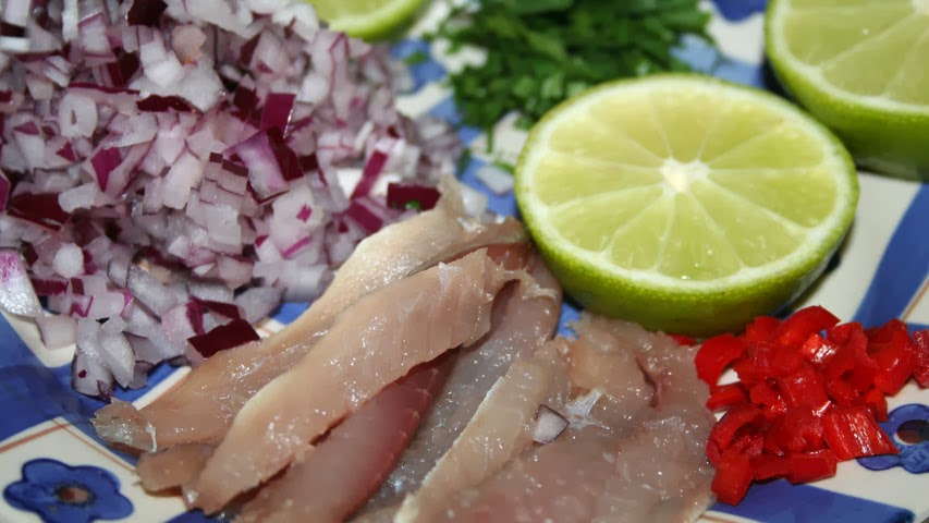 Los ingredientes de este cebiche son los tradicionales a excepción del pescado que es una delicia local