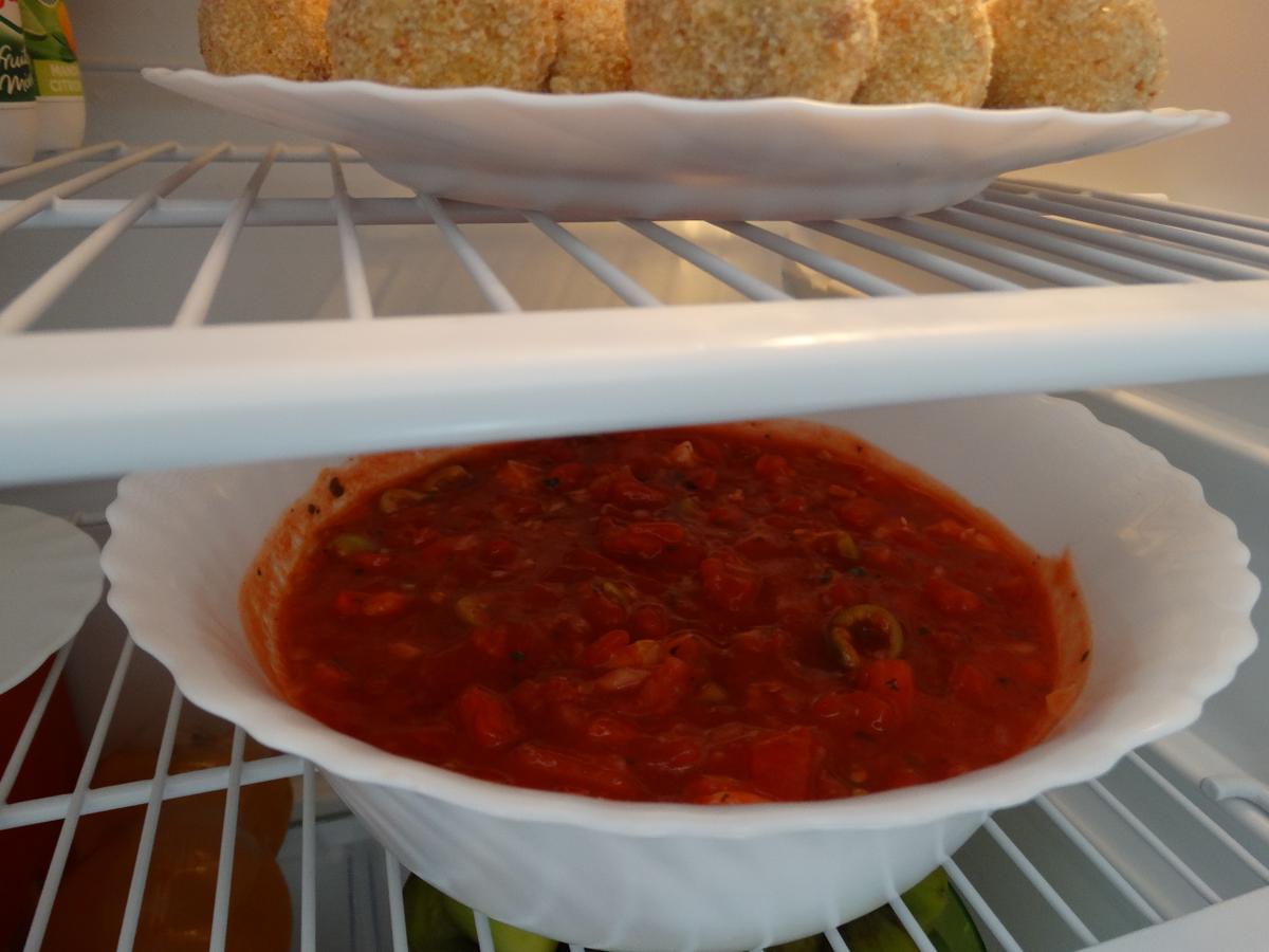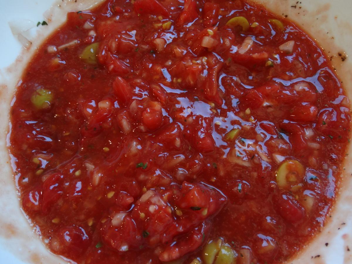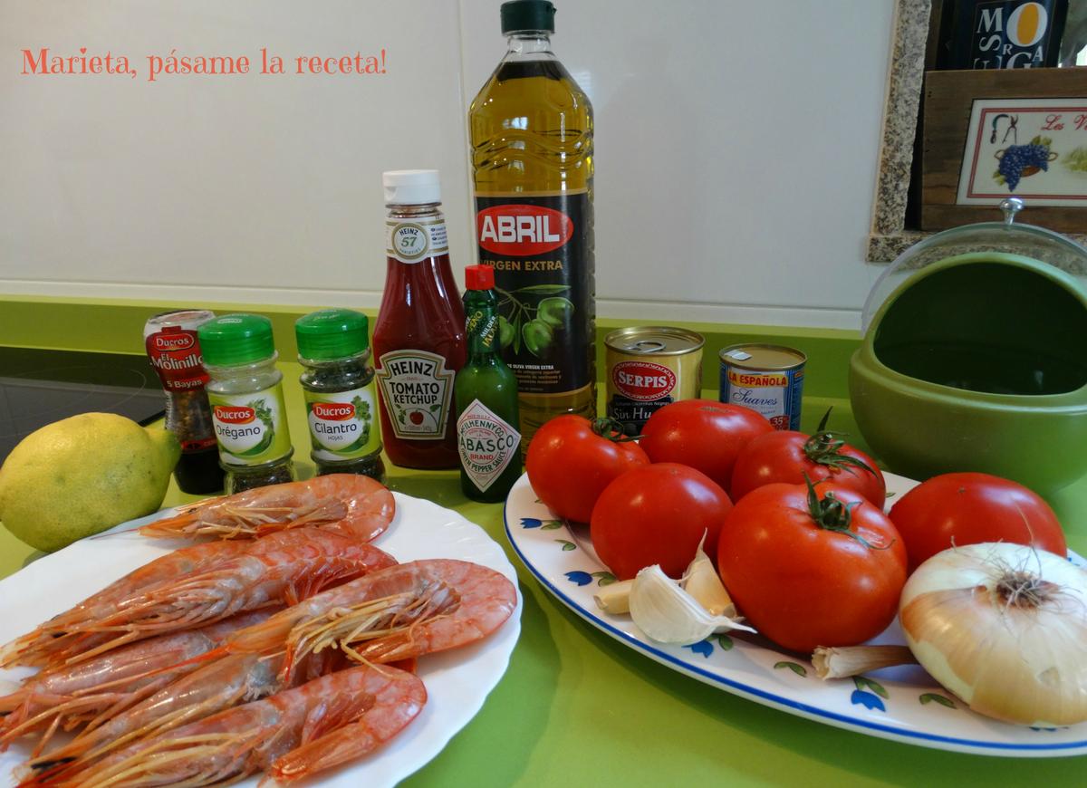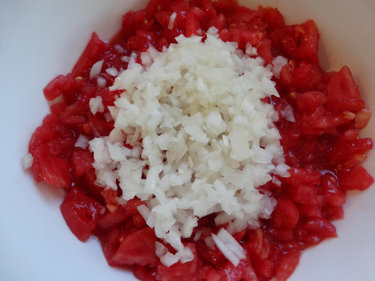 Picamos muy bien la cebolla y la incorporamos al tomate. Agregamos el cilantro, el orégano, el tabasco, el kétchup y las aceitunas verdes picaditas. Salpimentamos.