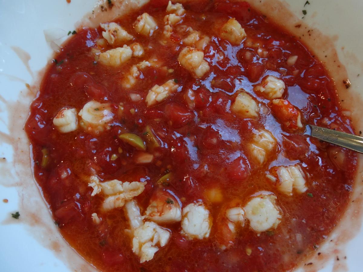 Este año el verano está resultando especialmente caluroso, incluso en la aldea, donde lo habitual es que al caer la tarde el termómetro empiece a bajar considerablemente, y acabes por ponerte encima una chaqueta y echando una mantita ligera a los pies de la cama. Pero esta vez no ha sido así y muchos días (y noches) el bochorno no ha dado tregua. Con temperaturas tan elevadas apetece comer cosas ligeras y fresquitas, así que ensaladas, pistos, gazpachos, salmorejos, cremas frías entre otros, han estado a la orden del día y han sido los “protas” de la cocina. La receta que os traigo esta vez es una de ellas, la suelo preparar a menudo cuando el calor aprieta y goza de bastante éxito entre los que la prueban. He tenido además la suerte de contar con ingredientes extraordinarios gracias a mi vecina Candita, una mujer encantadora y generosa a más no poder. En cuanto aterrizo en la aldea enseguida tengo en mi puerta un maravilloso surtido de productos de su estupenda huerta. Patatas, judías, pimientos, cebollas y unos tomates!… qué tomates más exquisitos! con ellos he preparado estas vacaciones litros de delicioso salmorejo, fantásticas ensaladas y el ceviche que os describo a continuación y que está rico, rico, rico!