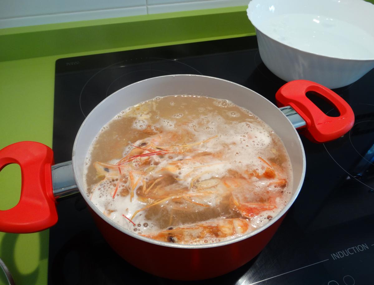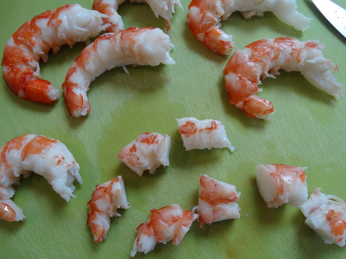 Comenzaremos por cocer los langostinos en abundante agua hirviendo con sal por espacio de 2 o 3 minutos, e inmediatamente los pasaremos a un bol con agua muy fría y hielo. Cuando se hayan enfriado lo suficiente los pelamos y los cortamos en trozos pequeños.