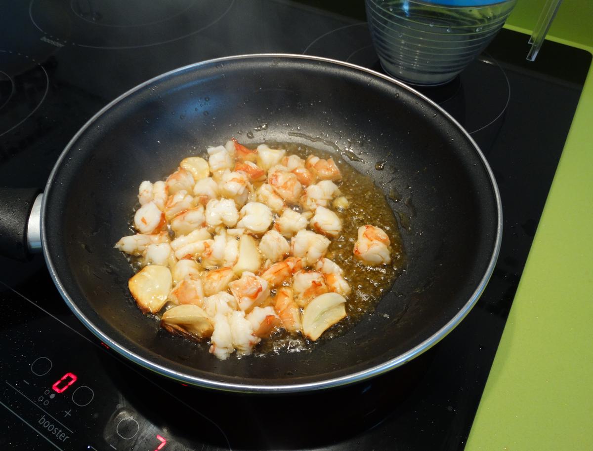 Ponemos en la sartén un fondo de aceite y doramos en él los ajos partidos por la mitad. Añadimos los trozos de langostinos, salteamos bien y regamos con el zumo de limón. Dejamos enfriar.