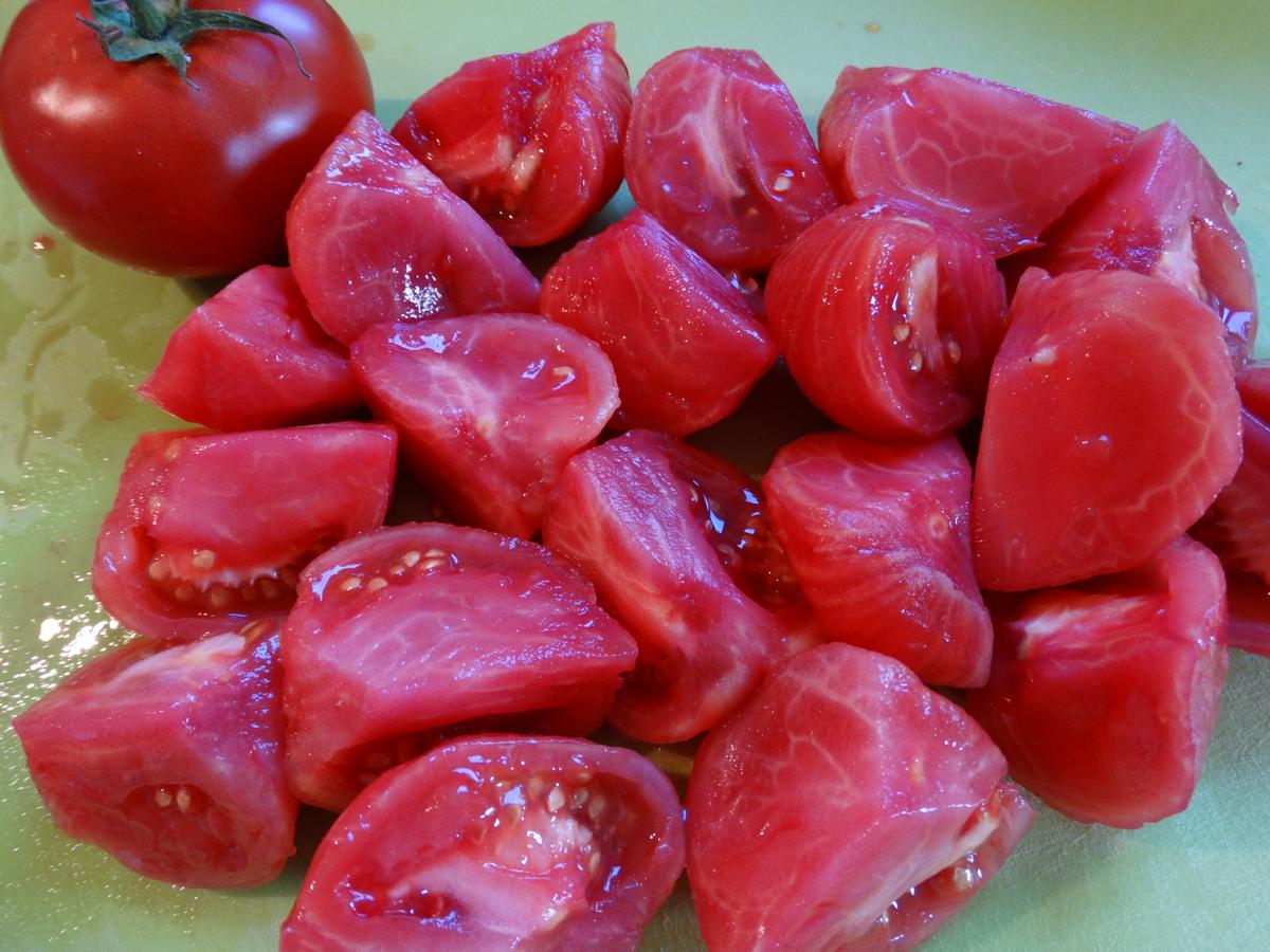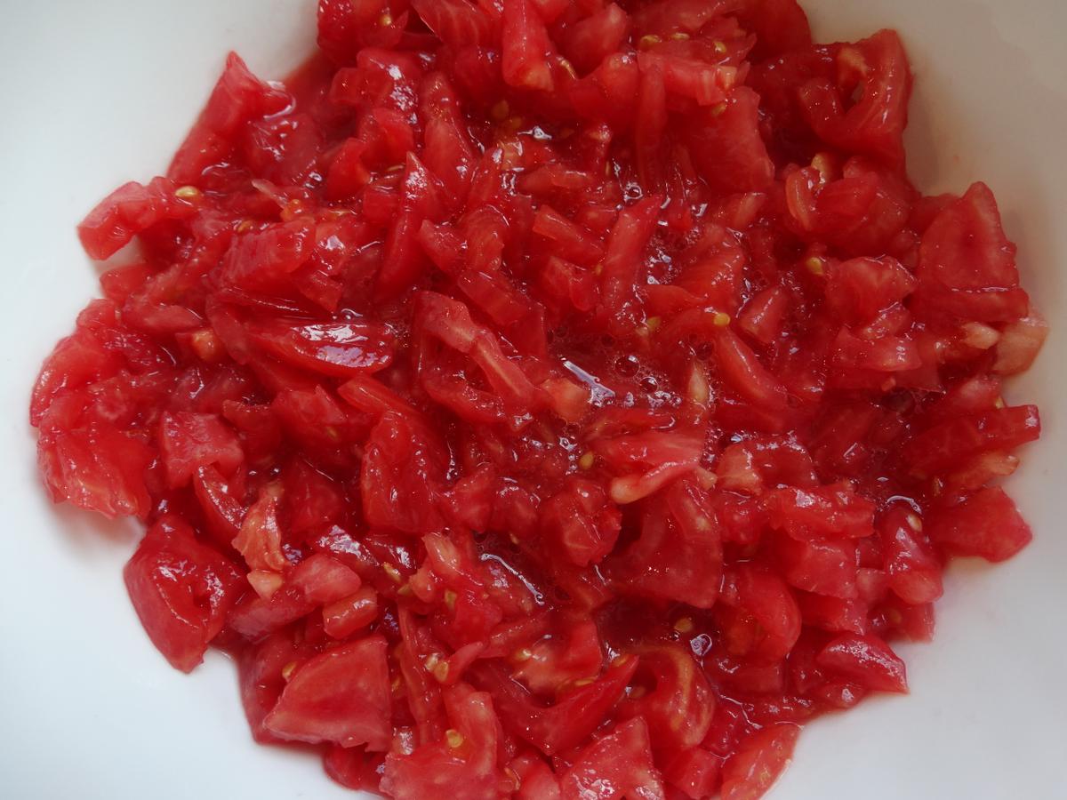 Mientras tanto pelamos y despepitamos los tomates y los los picamos muy menuditos.
