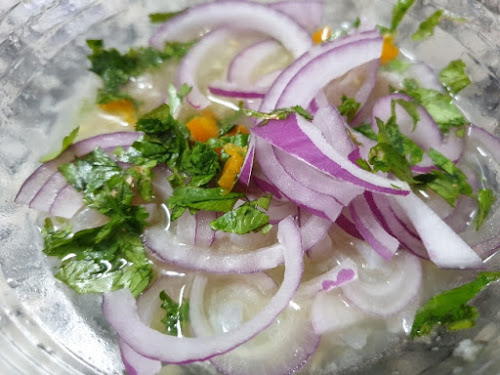 o Cortamos la cebolla morada en juliana muy fina y la lavamos. La dejamos en agua fría.