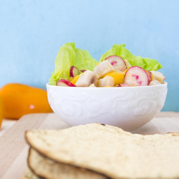 Con ayuda de un colador fino, drenar por completo el jugo de limón del ceviche. Transferir a otro tazón y agregar el rábano, mango, aceite de oliva, y miel de agave. Mezclar por completo y agregar sal al gusto.