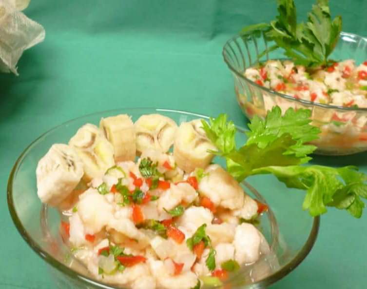 En un tazón mezcle el jugo de limón,jugo de naranja,salsa inglesa,sal,pimienta,tabasco,cebolla,chile dulce,apio y ajo triturado dejar reposar 10min minutos en refrigeración,luego agrega el pescado mezcle dejar reposar 10min minutos en refrigeración,pasado el tiempo rociar el culantro picado mezcle y sirva,acompañar con chips,rebanadas de banano verde,plátano verde o camote cocinado.
