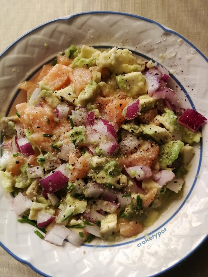 INGREDIENTES: Para 2-3 personas: 300 gr. de salmón fresco (por el tema del anisakis, previamente congelado), 1 aguacate, 1/2 Cebolla roja, 1 lima y media, sal y pimienta, y cebollino picado ( puede ponerse perejil, cilantro según gusto) a mí me encanta el salmón y el cebollino. Maiz cocido que puede ser descongelado.