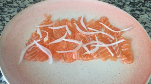 - Esparcir la cebolla por encima del salmón.