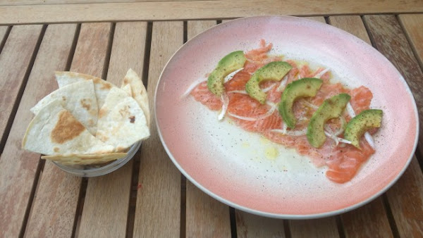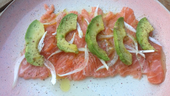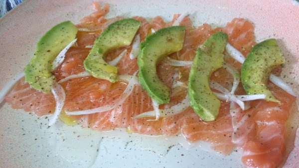 - Cortar el aguacate por la mitad, quitar el hueso y pelar. Cortarlo muy fino a lo largo y poner también sobre el salmón.