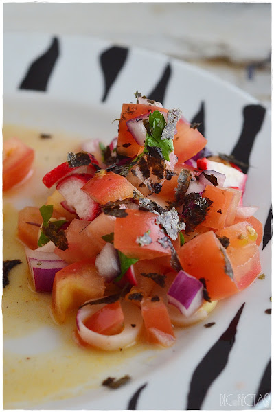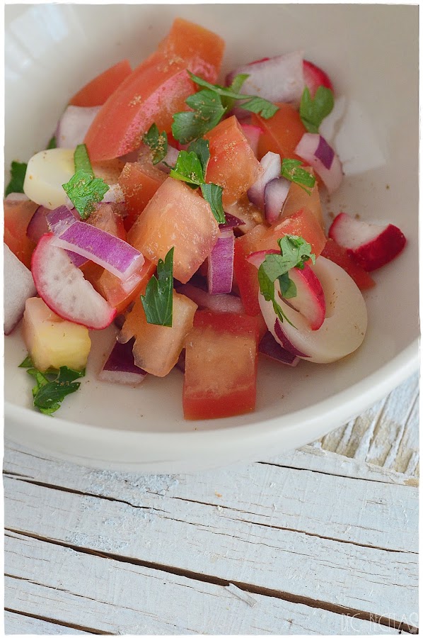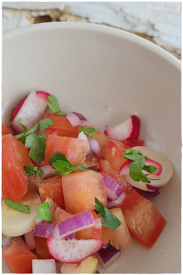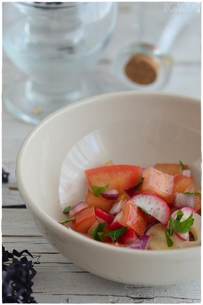 Esta receta es del blog Danza de Fogones y aparte de la fotografía que fue lo que mayormente me entró por los ojos, pude comprobar que es una receta espléndida para este tiempo sobre todo y muy fácil. Me parece un acompañamiento ideal para cualquier otro plato que se sale un poco de la habitual ensalada o guarnición típica