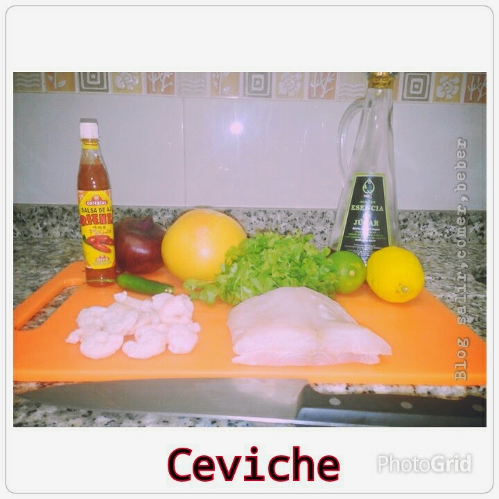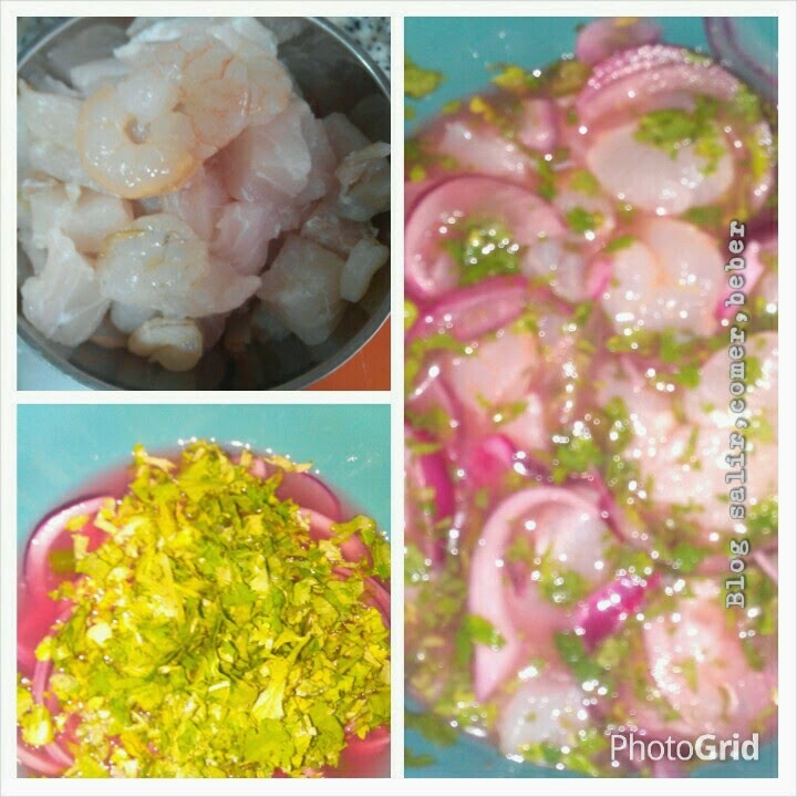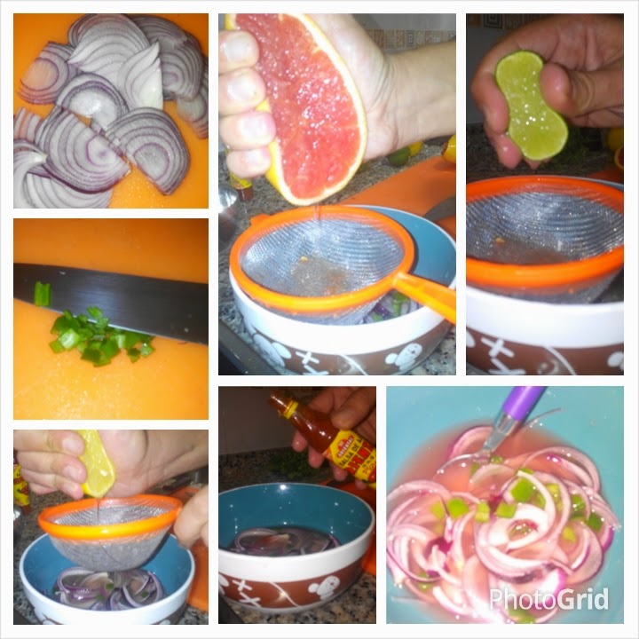 Picamos el cilantro y la cebolla roja en juliana (tiras finas) y reservamos. Exprimimos el pomelo, la lima y el limón en un bol, le añadimos un poco de aceite, sal, bastante pimienta, chiles picados y salsa de chiles al gusto, ser valientes que el resultado es mejor... Le incorporamos la cebolla y lo metemos un rato en la nevera para que se mezclen los sabores y vaya cogiendo frío.
