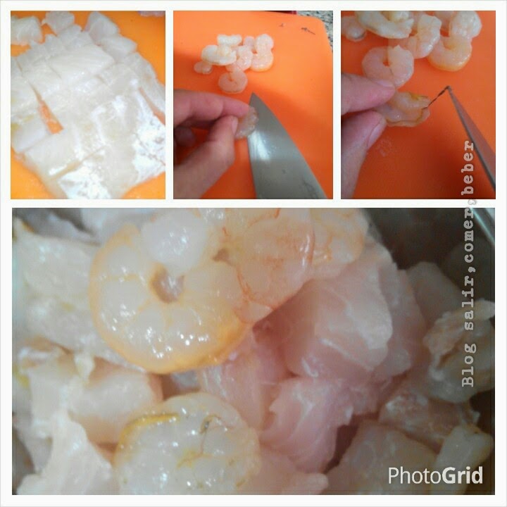 Cortamos el pescado en pequeños cubos y limpiamos las gambas quitándoles la tripa.