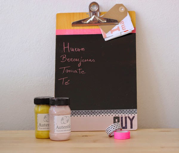 La Chalk Paint es una pintura 100% ecológica y no tóxica, perfecta para aplicar en proyectos de cocina. El primero de mis trabajos ha sido convertir una carpetita con pinza en una pizarra donde anotar mi lista de la compra. La tengo colgada en la despensa y voy apuntando todo lo que me hace falta. Es muy sencillo de hacer: usé pintura de pizarra y algo de washi tape para decorar.