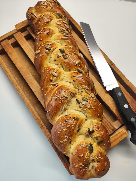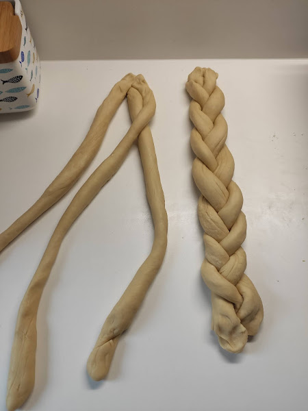 iguales, y cada parte en tres para hacer una trenza. Bueno como son dos panes, dos trenzas.