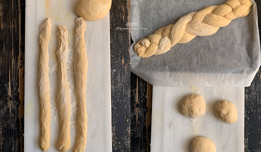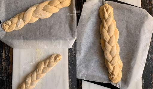 Disponemos esta primera trenza sobre una bandeja de horno protegida con papel vegetal. Y dividimos la porción más pequeña de masa en tres porciones, y procedemos de igual forma que la primera vez, haciendo otra trenza más pequeña.