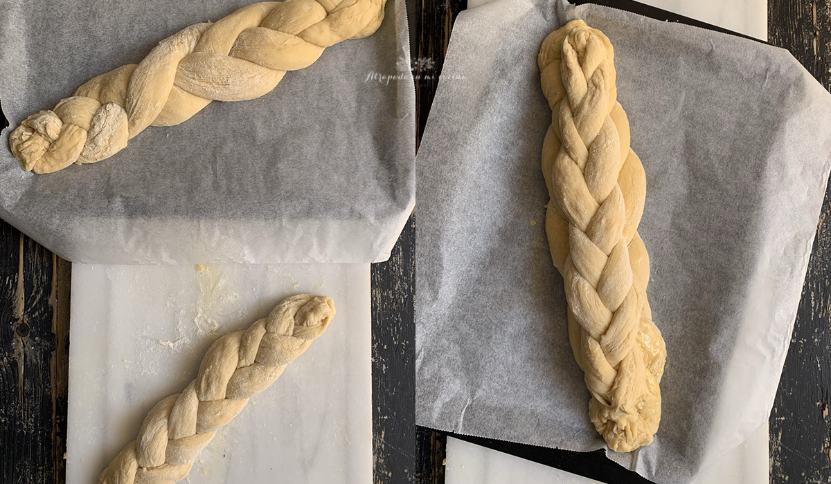 Pintamos con huevo batido la trenza grande y disponemos por encima la más pequeña. Tapamos con un paño húmedo y dejamos de nuevo que doble su volumen.