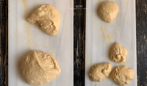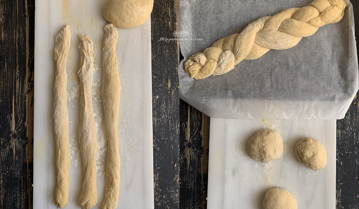Enharinamos la mesa. Dividimos la masa en dos porciones, una más grande que la otra, en una proporción de 2/3 y 1/3 aproximadamente. A su vez dividimos la masa grande en tres porciones iguales, y hacemos con cada una de ella una tira. Trenzamos.
