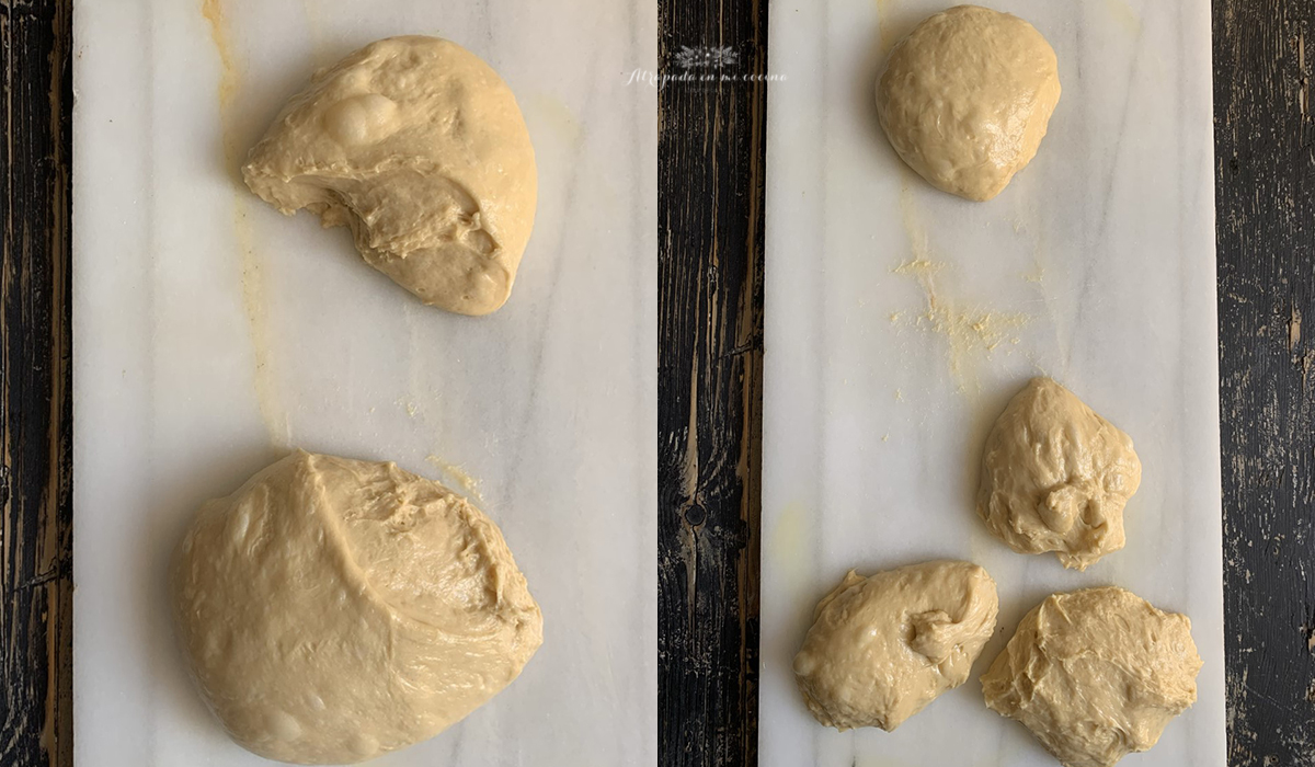 Una vez pasado el tiempo pasamos la masa a un bol aceitado y tapamos con film transparente, esperamos hasta que la masa doble su volumen, de hora a o hora y media.