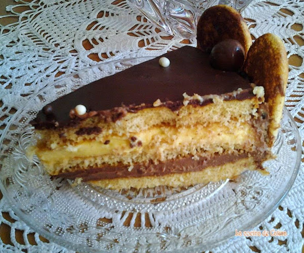 Sobre esta capa ponemos otra capa de bizcocho y la volvemos a bañar con almíbar, cubrimos con una capa de crema pastelera, última plancha de bizcocho, la bañamos como las otras y en este momento preparamos la cobertura de chocolate.