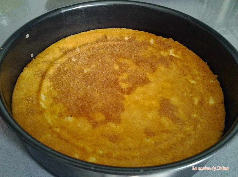En un molde desmoldable de 26 centímetros (utilizar el molde del que se disponga, o un aro extensible), se pone una base de bizcocho, bañamos con unas cucharadas de almíbar.