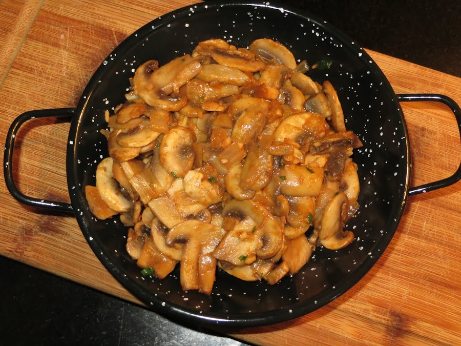 Echamos un par de cucharadas de aceite en la sartén y comenzamos a sofreír la cebolla cuanto esté un poco blanquecina añadimos los champiñones limpios y laminados y salamos. Cuando veamos que han soltado todo el agua. Retiramos la sartén del fuego y le echamos el pimentón y le damos varias vueltas.