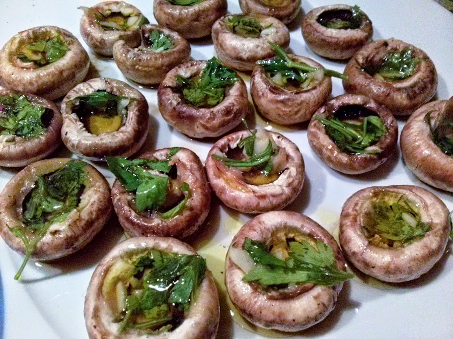 Cuando los champiñones estén tiernos, sácalos a una fuente de servir o bandeja. Pon un poco de sal en ellos y ve echando en cada uno una cucharadita del aceite con ajos y perejil reservado.