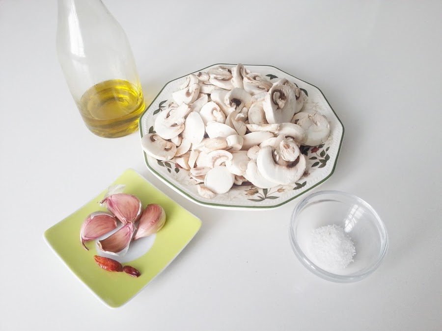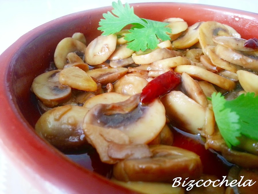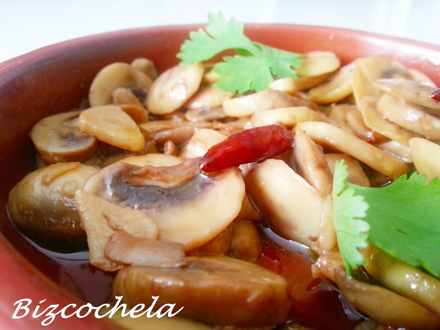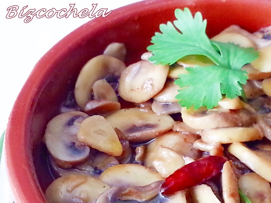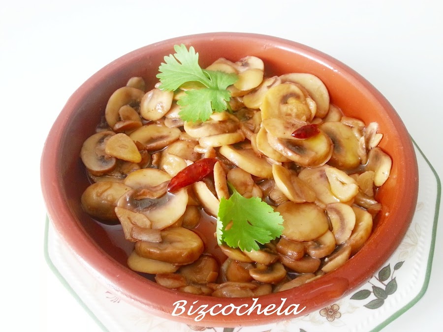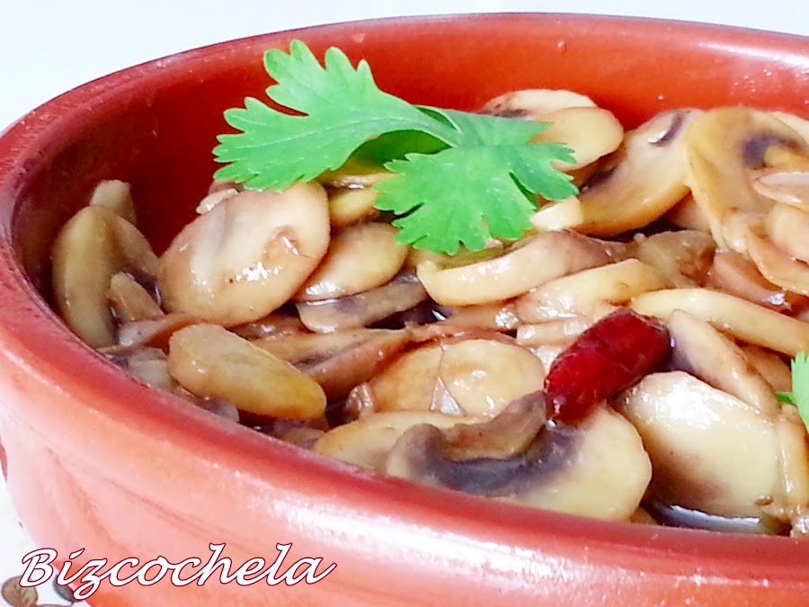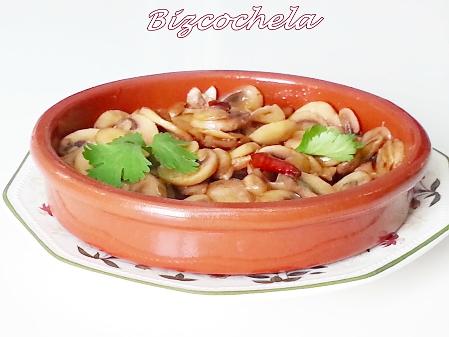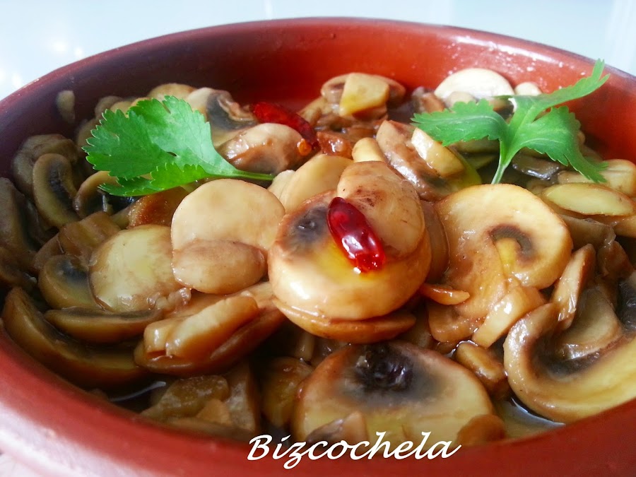 La receta tradicional lleva tanto aceite que los "champis" nadan en él, ero yo los he hecho con menos cantidad, más que nada para evitar la tentación de hacer "sopones", que no es plan....