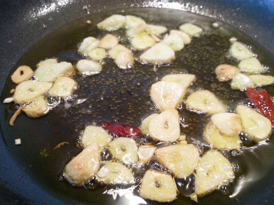 2. - Ponemos una sartén con abundante aceite y echamos la guindilla y los ajos a fuego medio, hasta que empiecen a tomar color.